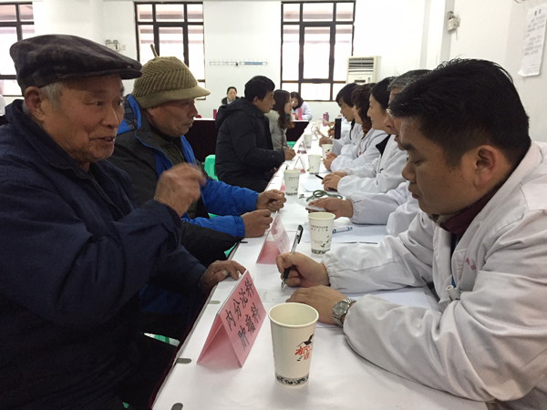 来自上海市多家三甲医院的60名医学专家在枫泾镇“三下乡”启动仪式现场为当地居民提供义诊。