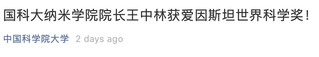 目前,王中林已经发表论文1500余篇,包括55篇在NATURE、SCIENCE及其子刊上发表的文章;根据Google Scholar的统计,他的论文被引用次数超过20.6万次,标志学术影响力的H指数为226。 2018年Google Scholar(谷歌学术搜索)公布的纳米技术与纳米科学专家全球排名(截至2017年11月),王中林排名第一。 很快,首位华人获爱因斯坦世界科学奖的消息,在微博引发热议↓↓↓
