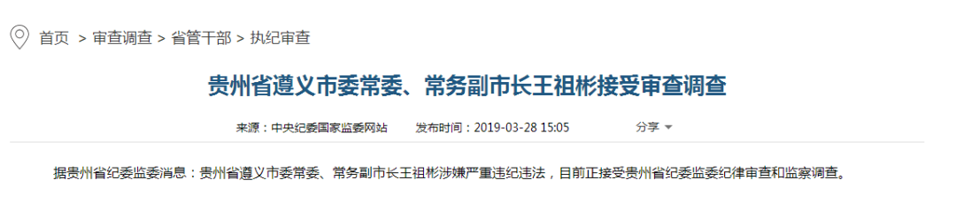 王祖彬比刘志义小3岁,早年曾在遵义市第三中学当老师。 根据简历,1996年8月到2001年11月,王祖彬在遵义市红花岗区先后任政府办副主任、区园林局局长、区委办公室主任,1997年11月,刘志义调到红花岗区委办,短暂当了几个月主任,之后晋升为区委常委、组织部部长。 刘志义在市委组织部工作的10多年间,王祖彬多次晋升,先是从红花岗区委办主任调到了遵义市政府当副秘书长,后又晋升为市政府秘书长,并于2012年2月履新遵义市副市长。2012年2月,刘志义任遵义市人大常委会副主任。 在担任副市长仅2年后,王祖彬再度晋升,跻身遵义市委常委,2016年12月成为遵义市常务副市长,今年3月28日被查。 去年4月落马的王晓光在遵义市工作多年,他2006年11月至2011年9月任遵义市副市长、代市长、市长,后到六盘水任市委书记。2013年11月,在遵义市委书记廖少华落马后,王晓光重回遵义,任遵义市委书记至2017年5月。 王晓光在担任遵义市常务副市长、代市长和市长期间,王祖彬是他的副手。王晓光重回遵义任市委书记后,王祖彬跻身遵义市委常委,先后担任遵义市副市长、政法委书记岗位。