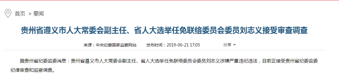遵义,古称播州,名始于唐贞观十六年,取义《尚书》“无偏无陂,遵王之义”,地处西南出海要道,全域纳入长江经济带,是贵州第二大城市。茅台集团总部便位于遵义市茅台镇。政知圈注意到,十八大后贵州遵义有多人落马。 2013年10月,时任贵州省委常委、遵义市委书记廖少华落马,成了十八大后首位被查的由省委常委兼任的地级市委书记,也是贵州落马“首虎”。 2018年4月,贵州省委原常委、原副省长王晓光成了国家监察委成立后的“首虎”,如果细心的话你会发现,王晓光曾在遵义工作多年,担任过遵义的党政一把手。 就在昨天,遵义方面再有一人被查。 组织系统工作多年 6月21日17时05分,中央纪委转发了贵州省纪委监委的一则消息,贵州省遵义市人大常委会副主任、省人大选举任免联络委员会委员刘志义涉嫌严重违纪违法,目前正接受贵州省纪委监委纪律审查和监察调查。