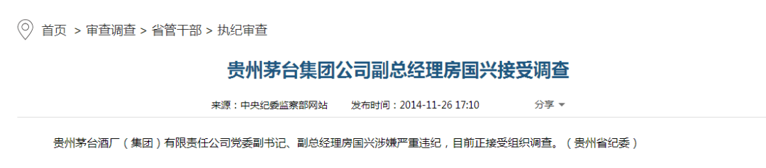 这并不是茅台这些年来首个落马的高层。2014年11月,茅台原党委副书记、原副总经理房国兴落马,房国兴早年曾担任遵义市政协副主席、仁怀市委书记,2013年1月履新茅台副总经理职务。