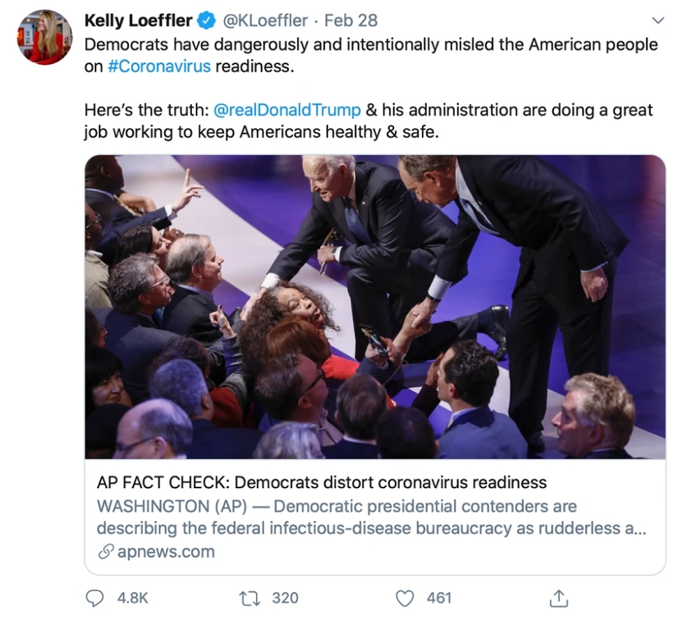 涉嫌利用疫情在股市套利 今年一月,洛夫勒在她宣誓就职佐治亚州参议员两周后,参加了由政府组织的新冠病毒非公开简报会,出席该会议的还有包括安东尼·福奇博士在内的抗疫工作小组专家。据《纽约时报》报道,出席会议后不久,洛夫勒和丈夫就开始出售价值数百万美元的股票,并且在接下来的几周持续抛售包括大型零售公司在内的多只股票,这些公司的股价都在疫情暴发后遭遇暴跌。此举看来,洛夫勒似乎是意识到了疫情的严重性,因此赶在股票市场崩盘前减少损失。但在面对公众时,她却说出与自身行动相悖的言论。2月28日,洛夫勒在社交平台发文写道:“民主党人一直在故意误导美国人民去为新冠病毒做准备,但事实上,特朗普政府在保护美国人民的健康安全方面已经做得很好了。” ![]()