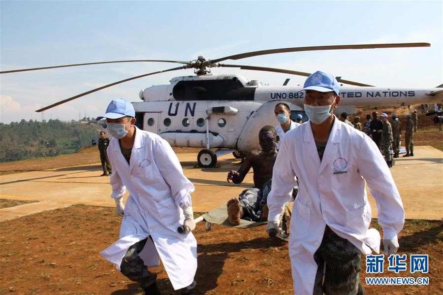 2010年7月3日,中国赴刚果(金)维和医疗分队医护人员在刚果(金)南基伍省布卡武机场运送油罐车爆炸中的受伤者。 新华社发(郭云飞摄)