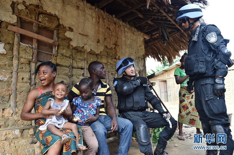 2015年11月3日,中国维和警察防暴队队员在利比里亚格林维尔的一座村庄询问当地治安等情况。 新华社记者 孙瑞博 摄