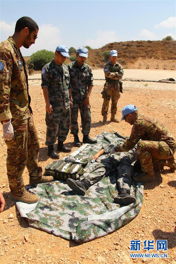 2018年8月21日,在位于黎巴嫩南部的联合国驻黎巴嫩临时部队(联黎部队)射击训练场,中国和意大利赴黎巴嫩维和官兵进行紧急医疗救援交流。 新华社发(杨双权摄)