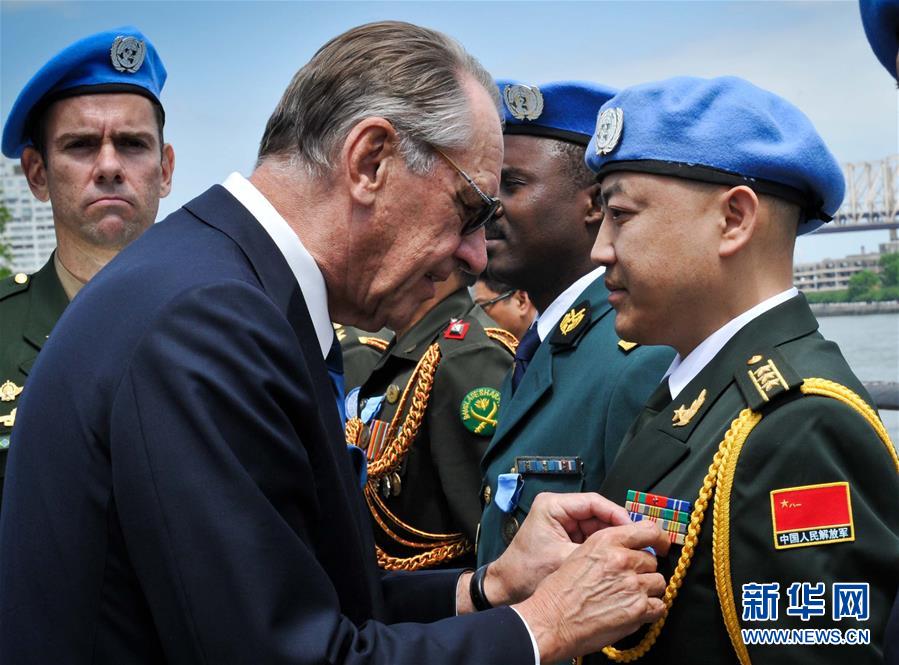 2014年5月29日,时任联合国常务副秘书长埃利亚松(左)在纽约联合国总部举行的国际维和人员日纪念活动上为中国维和军人佩戴奖章。 新华社记者牛晓雷摄