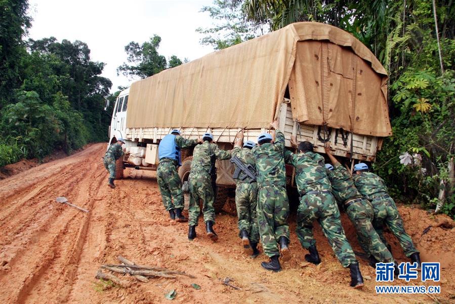 2006年6月2日,在利比里亚蒙罗维亚,中国驻利比里亚维和运输分队的士兵合力推动陷在泥泞中的车辆。 新华社发(范德银摄)