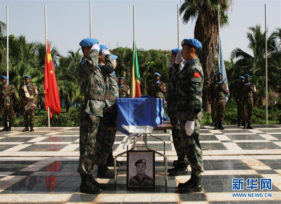 2016年6月7日,联合国马里多层面综合稳定特派团在位于马里首都巴马科的总部,为牺牲的中国维和战士申亮亮举行追悼会。 新华社发(杨祖荣摄)