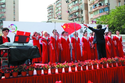 ![]() 去年6月底,合唱队举办歌唱祖国快闪活动 ![]() 队员们在排练 ![]() 合唱队在居民区演出