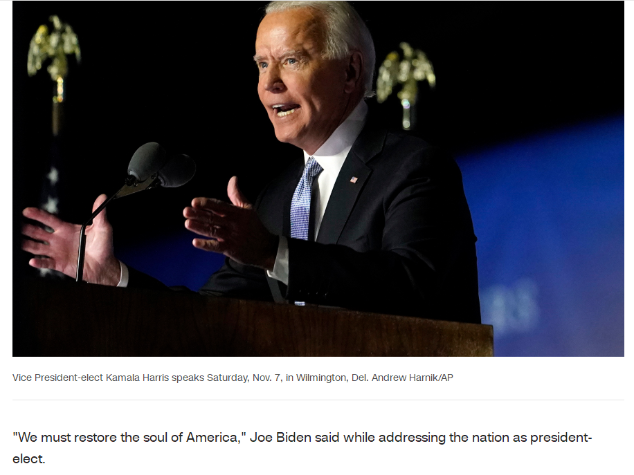 美国东部时间7日晚8时(北京时间8日9时)许,拜登和哈里斯在特拉华州威尔明顿向全国发表讲话。据美国有线电视新闻网(CNN)报道,哈里斯以当选副总统身份首先发表胜选演说,随后拜登以当选总统身份登场发表讲话,他在讲话中表示,“必须重塑美国的灵魂”。