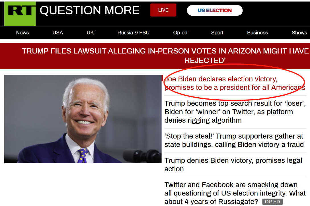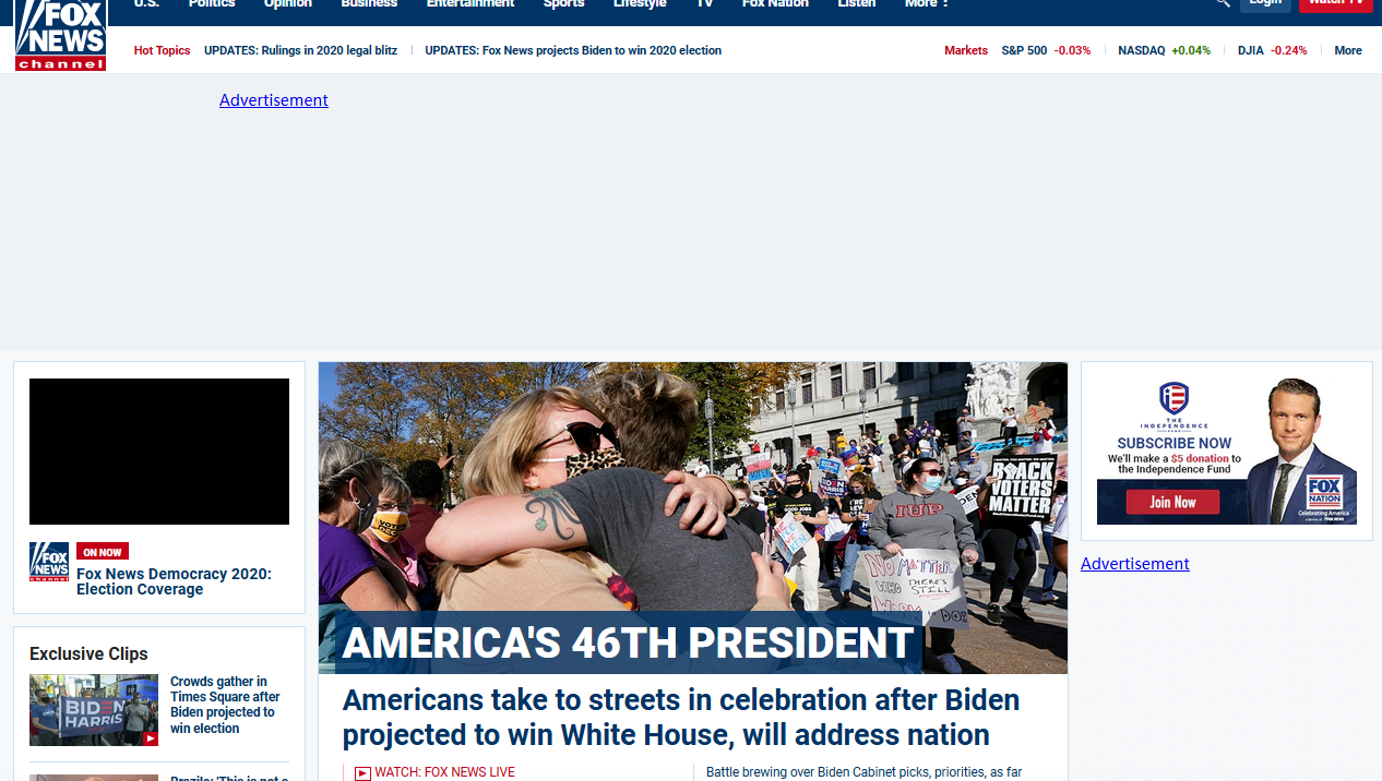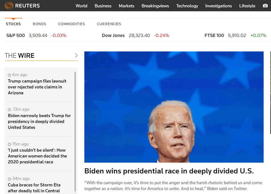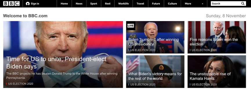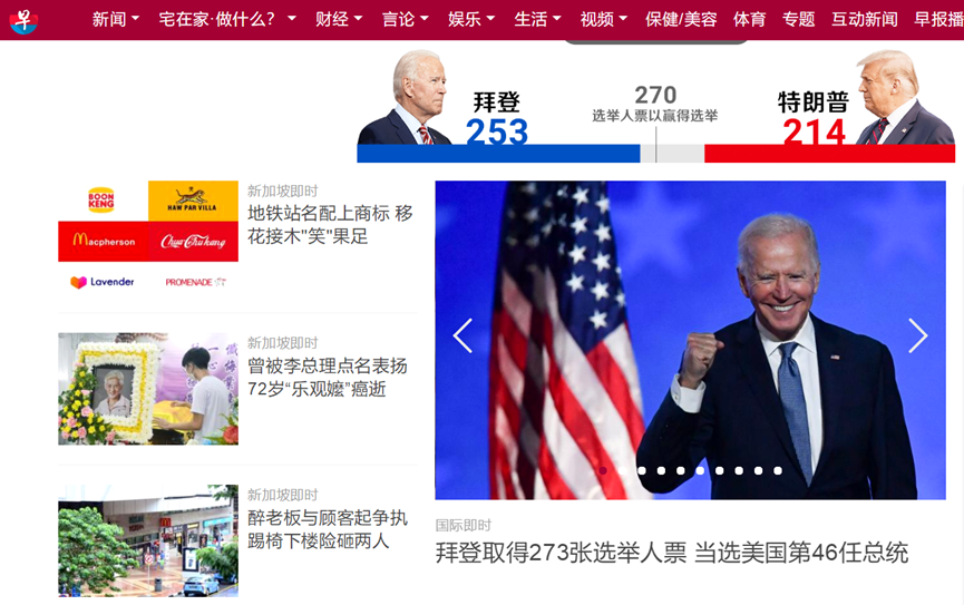 美国有线电视新闻网(CNN):拜登,赢 ![]() CNN称,拜登已经赢得了2020年美国总统大选,他将在美东时间晚20时发表胜选演讲。如果拜登成功当选,CNN称,民主党副总统候选人卡马拉·哈里斯(Kamala Harris)将会是美国第一位非裔副总统,也是担任该职位的第一位女性。 美联社:拜登击败特朗普胜选,称“现在是到了疗伤的时刻了” ![]() 美联社在报道中称,11月7日,拜登击败特朗普,成为美国第46任总统,为领导一个饱受新冠病毒及经济社会动荡不安而影响的国家做好了准备。他在声明中称,是时候让这个饱受重创的国家“团结起来,疗伤了”。 美国福克斯新闻:美国第46任总统 ![]() 福克斯新闻通过首页轮播图的方式,展现了在拜登胜选之后,美国人走上街头庆祝,同时预告拜登将向全国发表讲话。 哥伦比亚广播公司新闻台(CBS):直播人们庆祝实况 ![]() 哥伦比亚广播公司新闻台(CBS)在首页通过直播实况,反映美国人在拜登胜选后走上街头庆祝。此外,CBS还在报道中提到,现年78岁的拜登将成为美国历史上年纪最大的当选总统。 英国广播公司(BBC):当选总统拜登表示,对美国来说是时候团结起来了 ![]() “这一大选结果让特朗普成为自上世纪90年代以来,第一位无法连任的美国总统。”英国广播公司(BBC)这样写道。BBC称,对拜登最终获胜的预测,是基于那些已经结束计票的各州的非官方结果,以及威斯康星州等仍在点票州的预期结果。 BBC报道还称,截至目前,拜登已经赢得了7300多万张选票,这是美国总统候选人中赢得最多选票的一次;特朗普则入手近7000万张选票,是美国历史上第二多的得票结果。 英国路透社:拜登在分歧严重的美国赢得总统大选 ![]() 路透社在头条报道中则指出,“在严重分裂的美国,拜登险胜特朗普而当选总统”。报道认为,拜登在宾夕法尼亚州赢得了20张选举人票,使他获得了当选总统所需的270张选举人票,结束了这个分裂严重的国家持续4天的“重大悬念”。 路透社称,与此同时,支持特朗普的愤怒示威者却聚集在密歇根州、宾夕法尼亚州和亚利桑那州等的议会大厦外,表达抗议。相比那些在华盛顿特区上街庆祝“拜登胜选”、高呼“我们是冠军”的人们,这两个强反差场景似乎在提醒我们,这个国家正处于严重的分裂。 日本主流媒体又怎么看? 日本广播协会(NHK):美国前副总统拜登当选,日本政府期待与他建立首脑关系 ![]() NHK8日将拜登胜选的消息放在了首页头条位置,不仅如此,前4条全是与美媒报道拜登胜选有关的内容。NHK还表示,日本政府期待与拜登建立首脑关系,并与他在全球变暖及应对新冠肺炎等问题上进行合作。 日本共同社:拜登胜选,拿下关键州,获得超半数选票 ![]() 共同社则在大标题上就写下“拜登胜选”这几个大字,并配了一张拜登正在开心地笑着的照片。共同社援引美媒消息称,拜登强调将把应对新冠、经济及种族问题的权利“交给美国国民”。 俄罗斯主流媒体“今日俄罗斯”(RT)及俄罗斯卫星通讯社也将“拜登胜选”的消息放上了首页头条。 “今日俄罗斯”(RT):拜登宣布大选获胜,承诺做“所有美国人的总统” ![]() RT在报道中表示,拜登将成为美国第46任总统,也将是年纪最大的当选总统,他将在本月晚些时候年满78岁。此外,RT也提到,共和党总统候选人特朗普的竞选团队则拒绝承认失败,特朗普还发表声明说,拜登的胜利是“有欺诈性的”。 俄罗斯卫星通讯社:拜登宣布大选获胜 ![]() 卫星社称,英国首相鲍里斯·约翰逊、法国总统马克龙、德国总理默克尔等领导人都对拜登进行了祝贺。不仅如此,欧洲议会副主席、北约秘书长斯托尔滕贝格也祝贺了拜登。然而,报道称,对于美媒密集报道拜登胜选一事,美国现任总统特朗普却表示,“是法律投票,而不是媒体在选举总统。” 韩联社:拜登胜选,韩国和平构想落实方式或生变 ![]() 韩联社称,当地时间7日,美国民主党总统候选人拜登获得的选举人票数超过270张,在本届美国大选中获胜。在美国政府换届后,韩方预计会继续同美国新政权加强沟通。报道称,韩国政府5日召开外交安保部门首长会议,强调政府将基于坚固的韩美同盟继续努力,不让韩美关系发展出现空白。 新加坡《联合早报》:拜登取得273张选举人票,当选美国第46任总统 ![]() 新加坡《联合早报》则援引多家美国主流媒体和英国媒体等,拜登已经拿下宾夕法尼亚州的20张选举人票,至今已获得至少273张选举人票。“这表示,拜登已成功跨过入主白宫的门槛,成为当选总统。”《联合早报》说。 责任编辑:日升 (责任编辑:日升) |