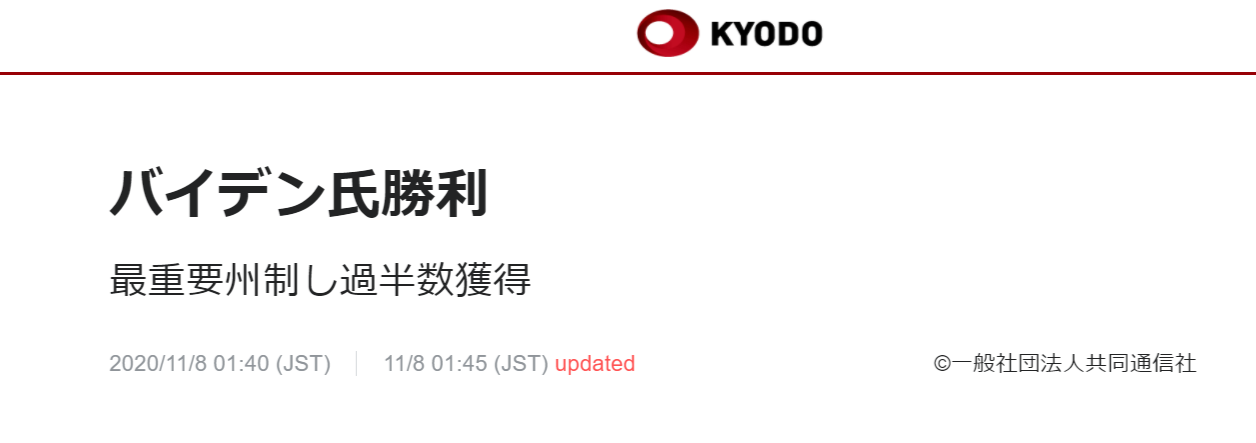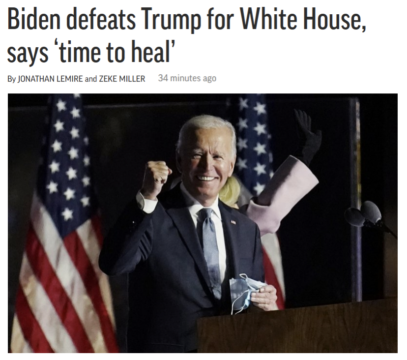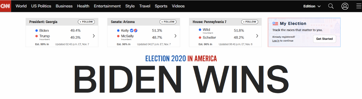 北京时间11月8日凌晨,据CNN、福克斯新闻等多家美国主流媒体统计数据显示,民主党总统候选人拜登已共计获得超过270张选举人选票。多家美媒随即密集报道“拜登胜选”,加拿大总理特鲁多等多国领导人随后向拜登送上祝贺。CNN甚至直接在头条位置大写两个单词——“BIDEN WINS”(拜登,赢)。