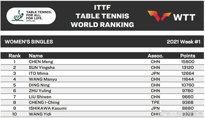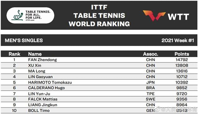 ![]() ![]() ![]() @人民日报体育 消息,北京时间1月8日,国际乒联公布了最新一期的世界排名,樊振东和陈梦分别领衔男女选手排行榜。男单的2-5名分别是许昕、马龙、林高远和张本智和;女单方面,孙颖莎、伊藤美诚、王曼昱、丁宁分列2-5位。 责任编辑:日升 (责任编辑:日升) |