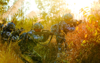 2月7日,海军陆战队某旅组织综合演练,陆战队员在芦苇丛中搜索藏匿的“敌人”。 新华社发