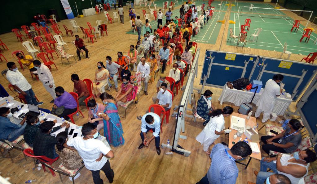 4月22日,居民在印度东北部城市高哈蒂的体育场排队接种新冠疫苗。(新华社发)