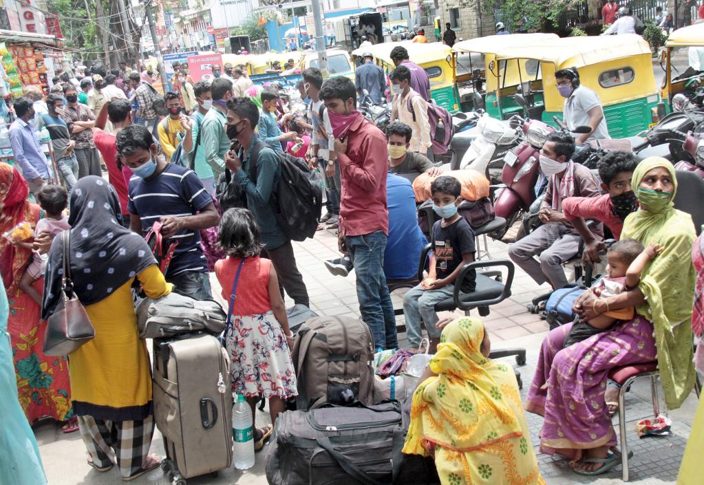 4月15日,戴口罩的人们在印度班加罗尔的一处车票销售中心外等待。(新华社发)