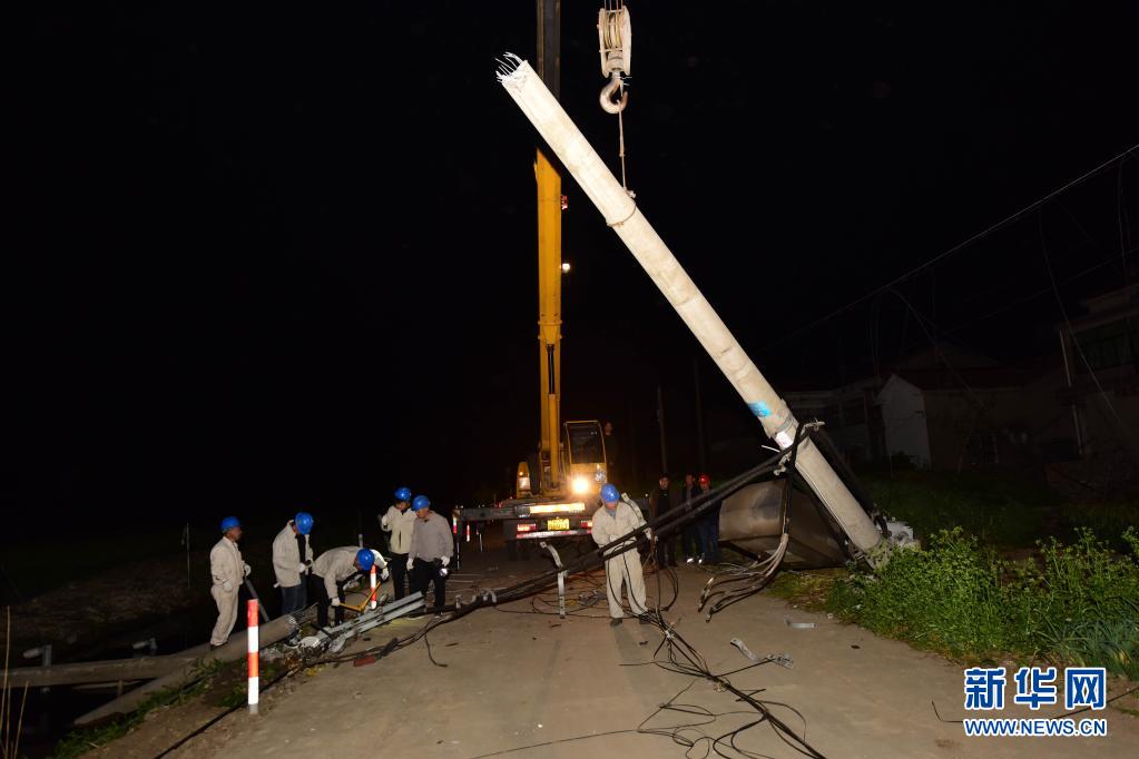 4月30日夜,在江苏淮安金湖县吕良镇陈庄村,抢修人员对受损电力线路进行抢修。新华社发(梁德斌 摄)