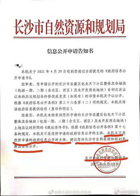 5月18日,记者从长沙市纪委获悉,对长沙市自然资源和规划局(以下简称资规局)政府信息公开告知书事件已经启动问责,其中对3名领导责任人分别作出党内警告、党内严重警告处分,2名直接经办人作出政纪处分并调离现任工作岗位,1名经办人受到批评教育。 近日,一份长沙市资规局的《信息公开申请告知书》文件内容表述“建议您向长沙市自然资源和规划局提出信息公开”,而文件的落款和印章也是“长沙市自然资源和规划局”,这份自相矛盾的文件如何形成? 长沙市纪委查明,自2019年4月28日起,长沙市资规局为了提升政务公开办事效率,将1枚“长沙市自然资源和规划局政府信息公开专用章”交由湘江新区国土规划局代管,专项用于湘江新区范围内相关政府信息公开。 湘江新区国土规划局在受理本次事件涉及的信息公开申请后,经办人本应向长沙市资规局调取相关材料后提供给申请者,但经办人未予调取,并要求申请人重新自行向长沙市资规局申请。在回复行文中又简单套用长沙市资规局专用函头、落款及公章,造成了自相矛盾。该局相关领导在审核过程中也未履行把关职责。