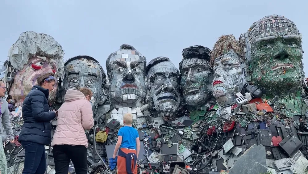用废弃电子产品制作的垃圾版“总统山”矗立在七国集团峰会举办地附近。视频截图