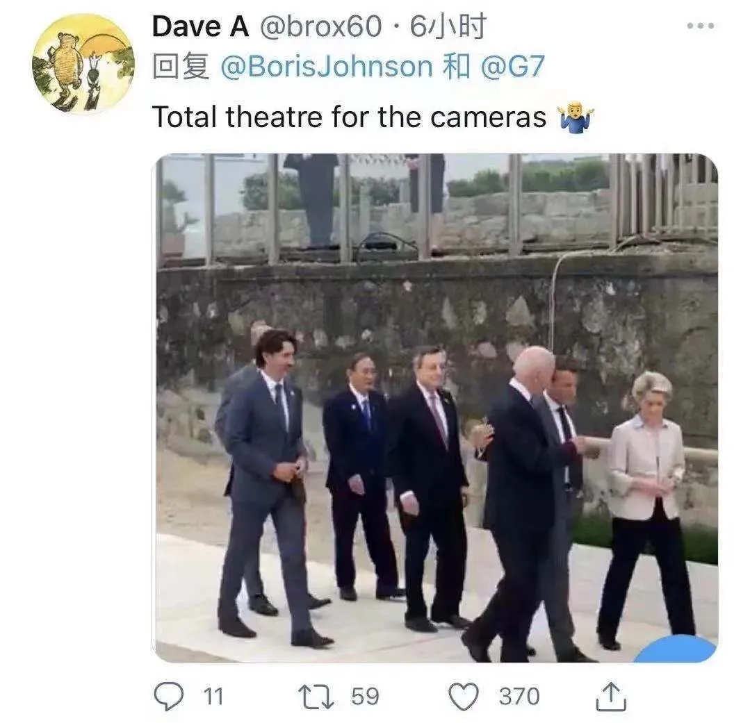 3 着急秀团结 却秀了个寂寞 峰会开幕当天,英国首相约翰逊携新婚夫人在会场外的海滩迎接其他参会领导人,并与每个人碰肘致意。约翰逊特意在社交媒体上放出这段欢迎视频,想要秀一秀七国集团“克服疫情、团结一心”的精神,结果却招来一片骂声。 有网友指责七国领导人违背英国政府制定的防疫规定,比如,即便接种了疫苗也要保持社交距离,入境须检测或隔离。 网友留言说:“纯作秀!我猜他们晚餐时很快就会亲亲热热坐在一起吃饭。”“口罩去哪儿了?除了加拿大总理,没人戴口罩。”“美国总统拜登哪天来的英国?10天前吗?那样他才有足够时间隔离。” ![]()