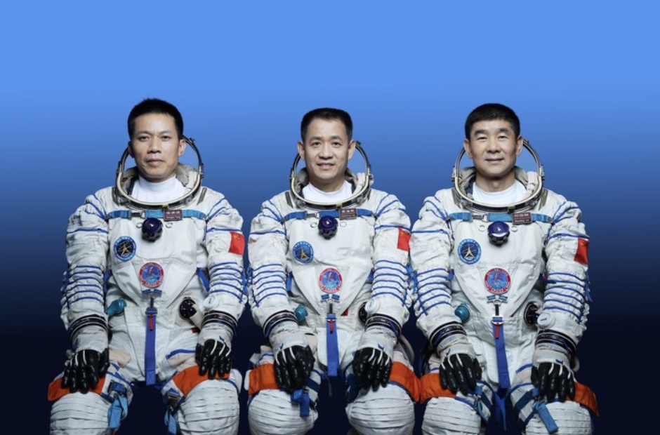 神舟十二号飞行任务乘组:聂海胜(中)、刘伯明(右)、汤洪波(左)。新华社发(徐部 摄)