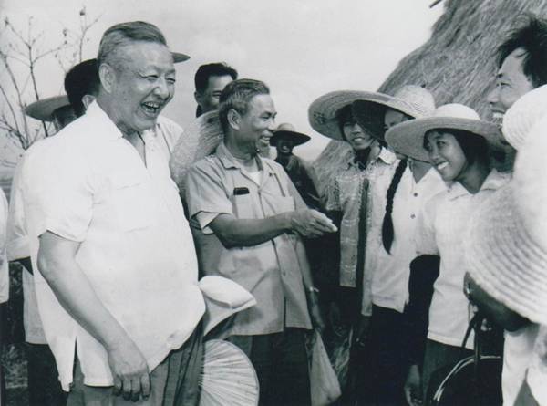 1980年8月底至9月初,习仲勋(左一)在广东湛江农村视察时与青年亲切交谈。