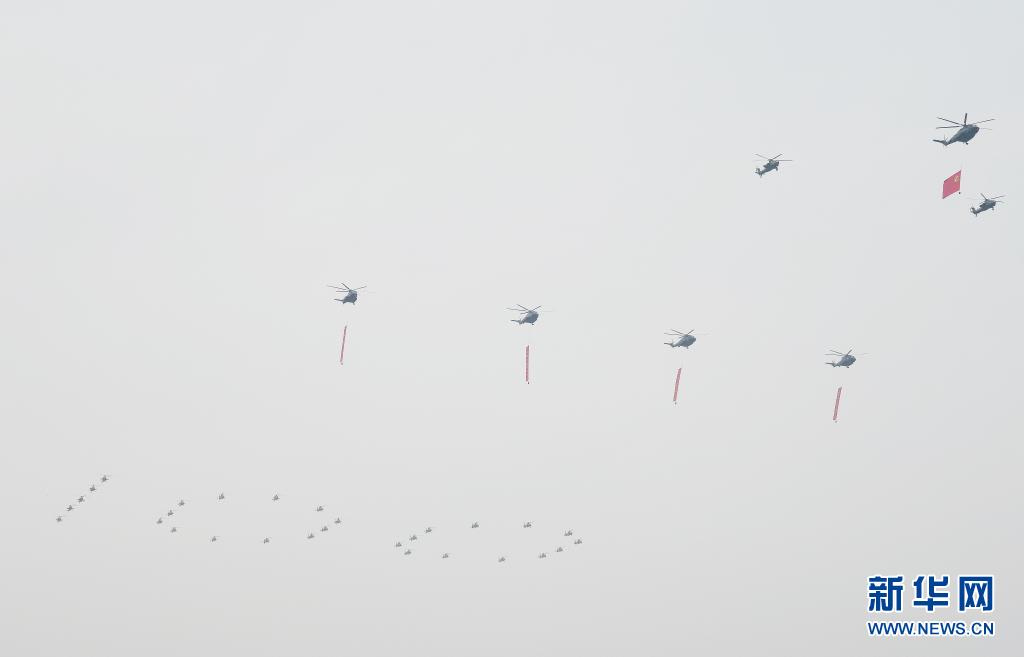 4架运输直升机,悬挂着4面巨幅标语紧随其后——“伟大的中国共产党万岁”“伟大的中国人民万岁”“伟大的中华人民共和国万岁”“全国各族人民大团结万岁”。 伴随着由远而近的轰鸣声,一个巨大的“100”字样出现在天空上,那是由5架直-10型、24架直-19型武装直升机组合而成的。 ![]()