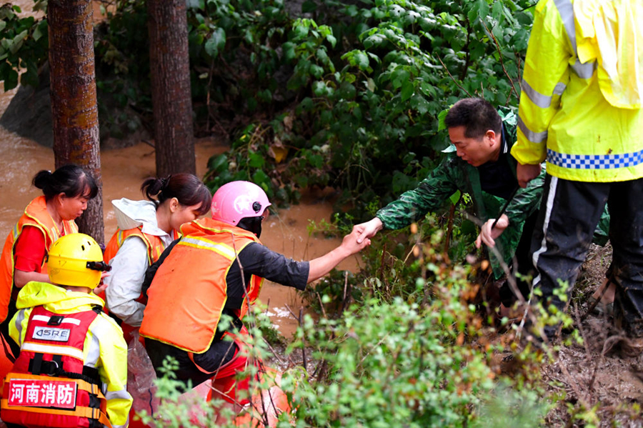 7月20日,消防救援人员在转移被困村民。新华社记者 郝源 摄