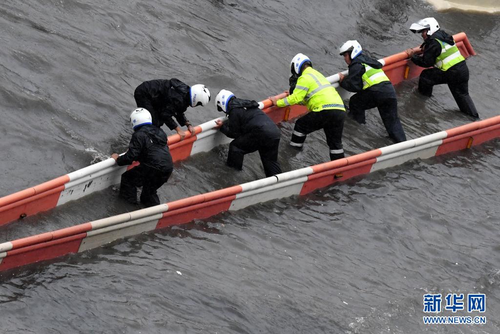 7月20日,交通警察在郑州市花园路冒雨修复交通设施。新华社记者 朱祥 摄