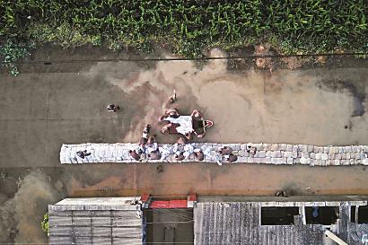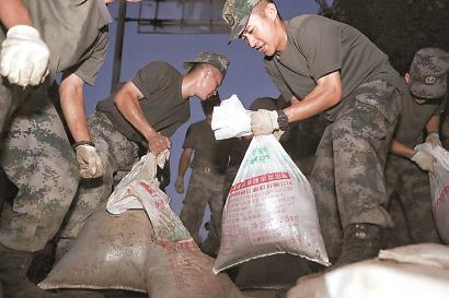 昨天下午,一辆辆满载官兵与抢险器材的运输车驶向河南省鹤壁市淇县西岗村。到当天22时,车上的300多名战士已在西岗村连续奋战7个小时,汗水、洪水浸透了衣服,拧干了继续干,喊起口号来依旧充满干劲儿,在西岗村筑起了一道长近千米,宽1.5米,高1.2米的人工堤坝。本报特派记者 孟雨涵 海沙尔 摄