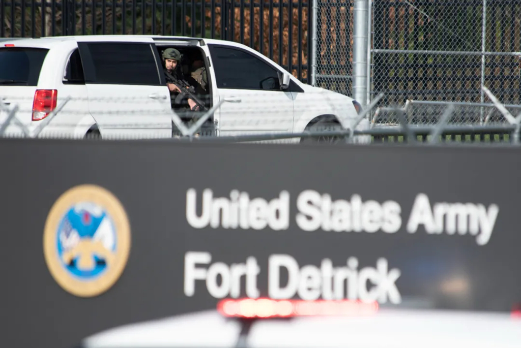 4月6日,特警人员准备进入美国马里兰州弗雷德里克市的德特里克堡军事基地。新华社/美联