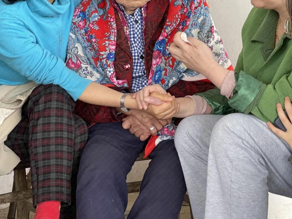 上海师范大学中国慰安妇问题研究中心调研团队成员紧握小瑞奶奶及其儿媳的手。(2021年5月摄,受访者供图)