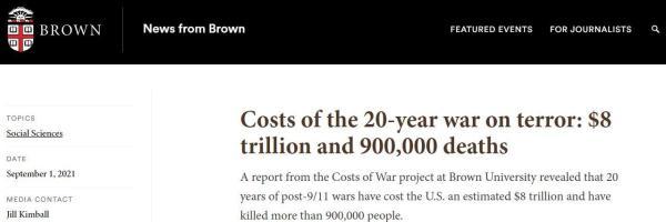 美国布朗大学(Brown University)的战争成本项目(Costs of War Project)当地时间9月1日发布的一份报告称,“9·11”事件后长达20年的战争已经使美国损失了大约8万亿美元,导致约90多万人丧生。