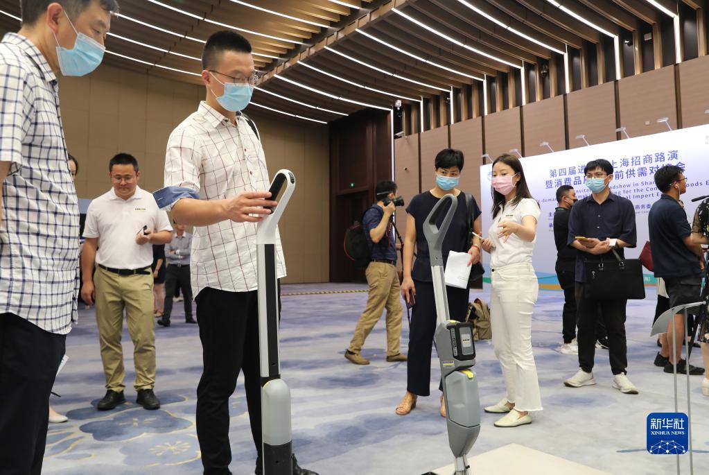 第四届进博会上海招商路演暨消费品展区展前供需对接会在国家会展中心(上海)举行,一家德国企业在对接会现场展出的清洁产品吸引参会嘉宾观看(7月15日摄)。新华社记者 方喆 摄