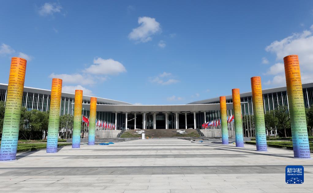第四届进博会装饰工程正在国家会展中心(上海)南广场进行(10月5日摄)。新华社记者 方喆 摄