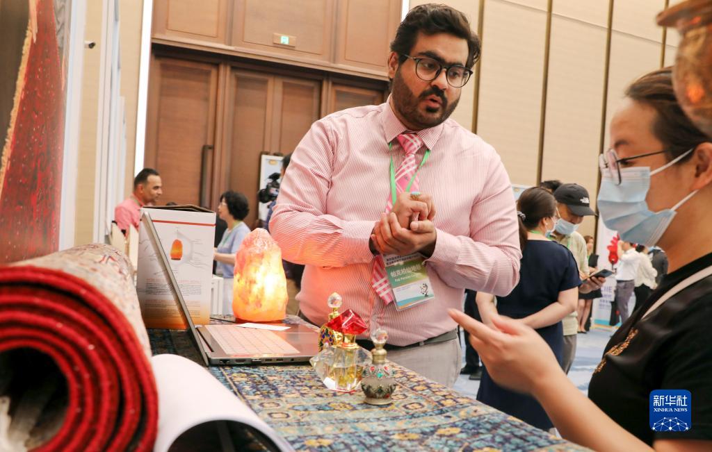 在国家会展中心(上海),参加第四届进博会上海招商路演暨消费品展区展前供需对接会的一名参展企业工作人员(左)向参会嘉宾介绍产品(7月15日摄)。新华社记者 方喆 摄