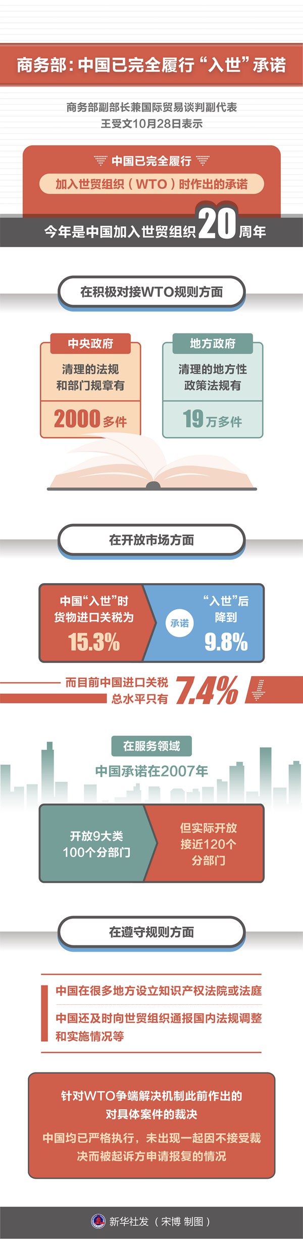 商务部副部长兼国际贸易谈判副代表王受文28日表示,中国已完全履行加入世贸组织(WTO)时作出的承诺,WTO几任总干事及大部分WTO成员都对此给予充分肯定和普遍认可。 今年是中国加入世贸组织20周年。王受文在国新办当日召开的新闻发布会上说,中国加入WTO时,明确了中国履行“入世”义务的时间表。“对照时间表可以发现,中国作出的承诺已得到完全履行”。 在积极对接WTO规则方面,王受文举例说,中国加入WTO后,需要修改相关法律、法规和政策使之符合WTO规则。为此,中央政府清理的法规和部门规章有2000多件,地方政府清理的地方性政策法规有19万多件。 在开放市场方面,王受文介绍,中国“入世”时货物进口关税为15.3%,承诺“入世”后降到9.8%,而目前中国进口关税总水平只有7.4%,“低于所有发展中成员,接近发达成员水平”。在服务领域,中国承诺在2007年开放9大类100个分部门,但实际开放接近120个分部门,“超过所作承诺”。 此外,在遵守规则方面,为加大对知识产权保护力度,中国在很多地方设立知识产权法院或法庭。中国还及时向世贸组织通报国内法规调整和实施情况等。 王受文还强调,针对WTO争端解决机制此前作出的对具体案件的裁决,中国均已严格执行,未出现一起因不接受裁决而被起诉方申请报复的情况。 针对一些成员认为中国没有很好地履行“入世”承诺的说法,王受文回应说,部分成员提出的关注或期待可能已超出WTO规定,比如要求中国履行一些高标准自贸协定中的规定,但实际上这与WTO要求相比,二者相差很大。“以超出的规定来说中国没有履行WTO义务,这是不合适的。” ![]() 责任编辑:日升 (责任编辑:日升) |