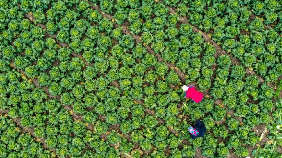 2021年11月4日,河北省唐山市丰南区王兰庄镇高先甸村的菜农在蔬菜基地收获大白菜(无人机照片)。新华社发(刘满仓摄)