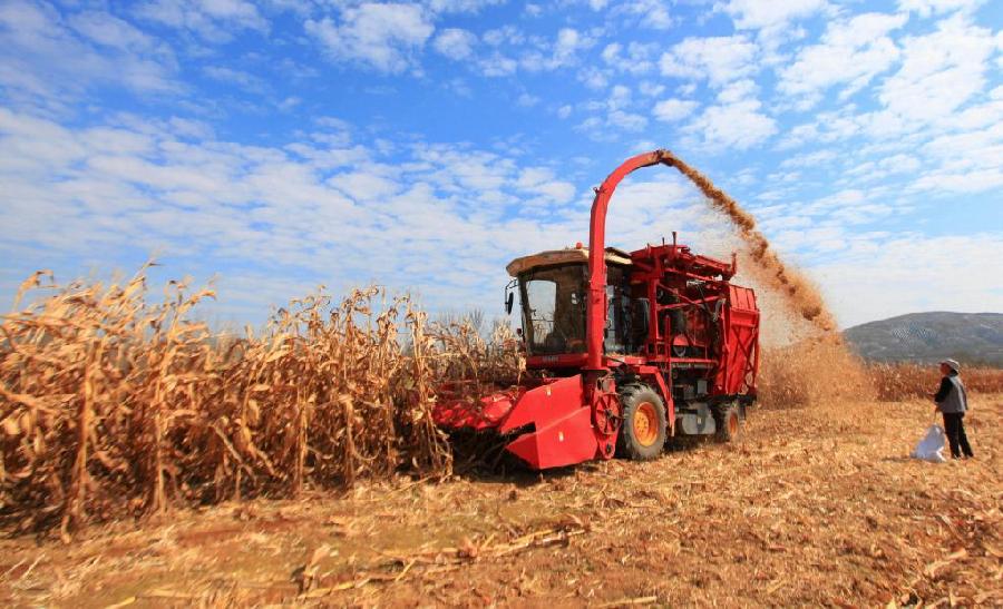 2021年10月23日,农民驾驶收割机在山东省临沂市平邑县流峪镇北申庄村田间收获玉米。新华社发(武纪全 摄)