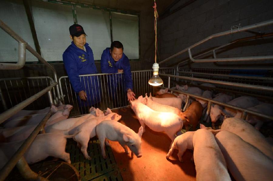 2021年11月3日,在贵州省黔南布依族苗族自治州罗甸县边阳镇油海村养殖场,马廷科(右)在查看生猪幼崽的生长情况。新华社记者 杨楹 摄