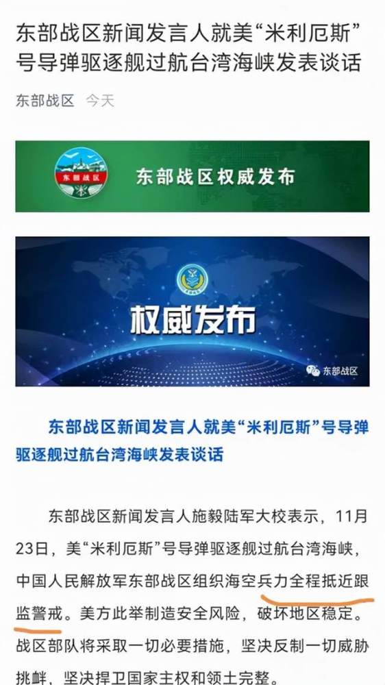 对于此次美舰过航的行动,东部战区新闻发言人施毅陆军大校回应称,11月23日,美“米利厄斯”号导弹驱逐舰过航台湾海峡,中国人民解放军东部战区组织海空兵力全程抵近跟监警戒。美方此举制造安全风险,破坏地区稳定。战区部队将采取一切必要措施,坚决反制一切威胁挑衅,坚决捍卫国家主权和领土完整。 请注意东部战区新闻发言人此次的提法相比以往有了些许变化。 ![]()