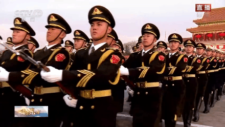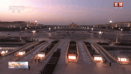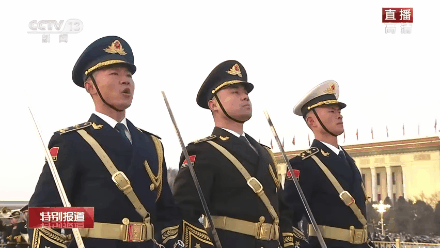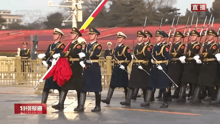 随着一声“正步走”的口令 三军仪仗队护旗编队 以铿锵有力的正步步伐 走过城楼中央、金水桥