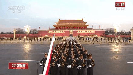 今天,伴随着神州大地 新年的第一缕阳光 天安门广场举行元旦升旗仪式 护旗方队步伐铿锵 雄壮国歌响彻广场 迎着第一缕晨光 城楼吹响升旗号角 升国旗仪式正式开始 三军仪仗队护旗而出 铿锵响亮的脚步声 响彻天安门广场