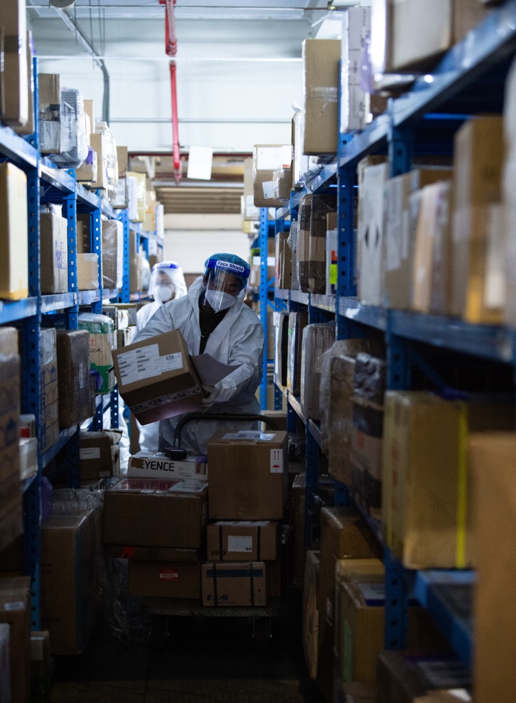 1月21日,北京天竺综合保税区,工作人员在待海关验放的境外邮件货架区作业。新华社记者陈钟昊 摄