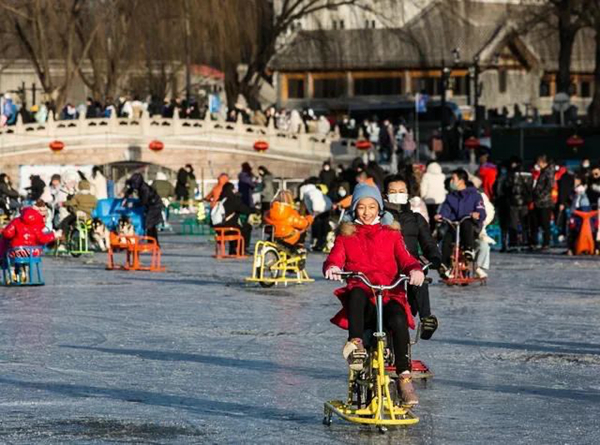 今年1月,什刹海冰场如期开放。冬日的阳光洒在冰面上。小组看到,除了滑冰,这里还有冰上自行车、冰车小海豹、冰上碰碰车等娱乐设施,俨然一个老幼皆宜的大型游乐场。 ![]()