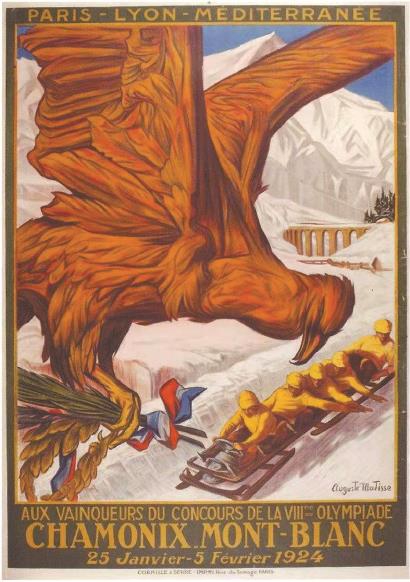 1924年法国夏蒙尼首届冬季奥运会宣传海报。在当时,该赛事只被称为“奥林匹亚德冬季运动周”