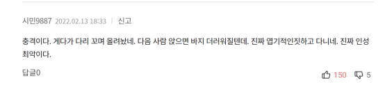 尹锡悦的这一举动很快引来批评。韩国执政党总统候选人李在明选举对策委员会首席发言人赵承来13日表示,这是公共座位,尹锡悦既没有对他人的关怀,也没有市民意识、公共道德。 《国民日报》称,虽然引发争议后,李相逸目前已经删除了照片,但网友已经把照片传遍互联网。随着争议扩大,尹锡悦随后也出来灭火。据《韩民族日报》报道,尹锡悦解释称,自己由于长时间移动,腿部出现轻微痉挛,在向参谋们请求谅解后,暂时抬起了腿。他还对此表示遗憾。 不过,网友们对尹锡悦的批评并没有停止,有网友认为他没有公共意识↓ ![]()