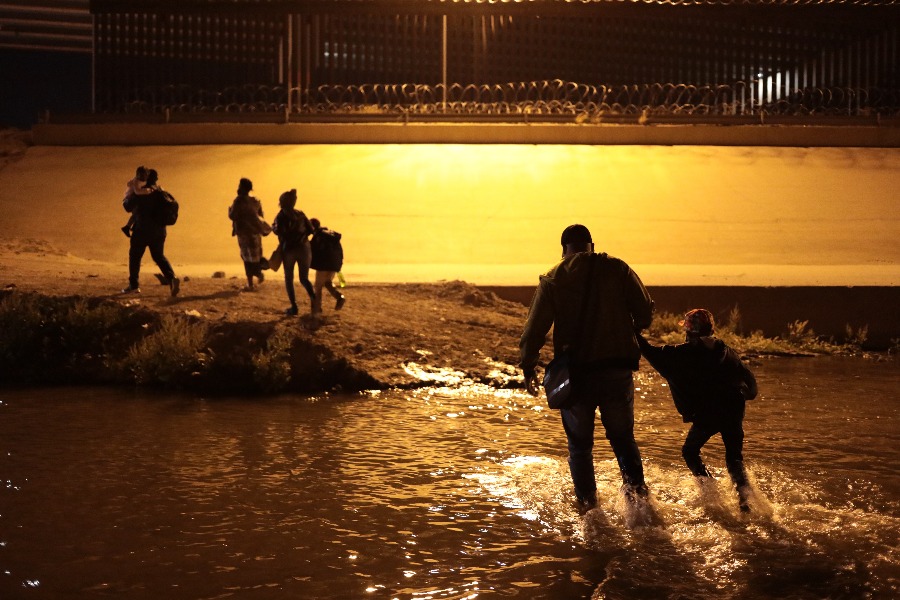 这是2021年3月30日在墨西哥边境城市华雷斯一侧拍摄的海地移民穿过布拉沃河从墨西哥试图进入美国。(新华社发,佩纳多摄)