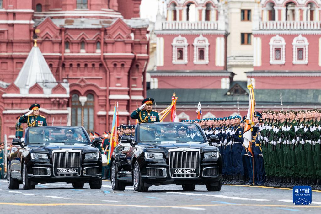 5月9日,在俄罗斯首都莫斯科,俄罗斯国防部长绍伊古(前)与俄联邦武装力量陆军总司令奥列格·萨柳科夫检阅部队。新华社记者 白雪骐 摄