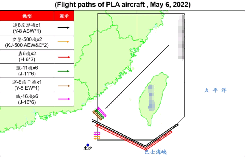 根据台湾设置的“即时军事动态”,解放军运8反潜机已连续4天深入台湾南方及东南空域。其中,6日当天包括轰-6、歼11、歼16等机型在内的18架解放军出动进行了训练,台湾“中央社”称,这是5月份解放军规模最大的一次飞行行动。9日早上,台湾媒体再度报道称,解放军的武直10现身东部空域,超低空飞行,可能是舰载直升机行动。